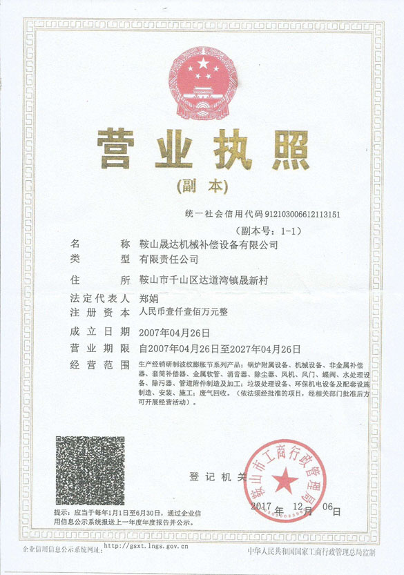 鞍山晟達機械補償設備有限公司成立于2007年4月,是生產(chǎn)、經(jīng)銷、研制波紋膨脹節(jié)系列產(chǎn)品,非金屬補償器,套筒補償器,橡膠接頭,電動擋板閥,卸灰閥,蝶閥,消音器,刮板機,除塵設備等環(huán)保類設備的專業(yè)生產(chǎn)廠家。